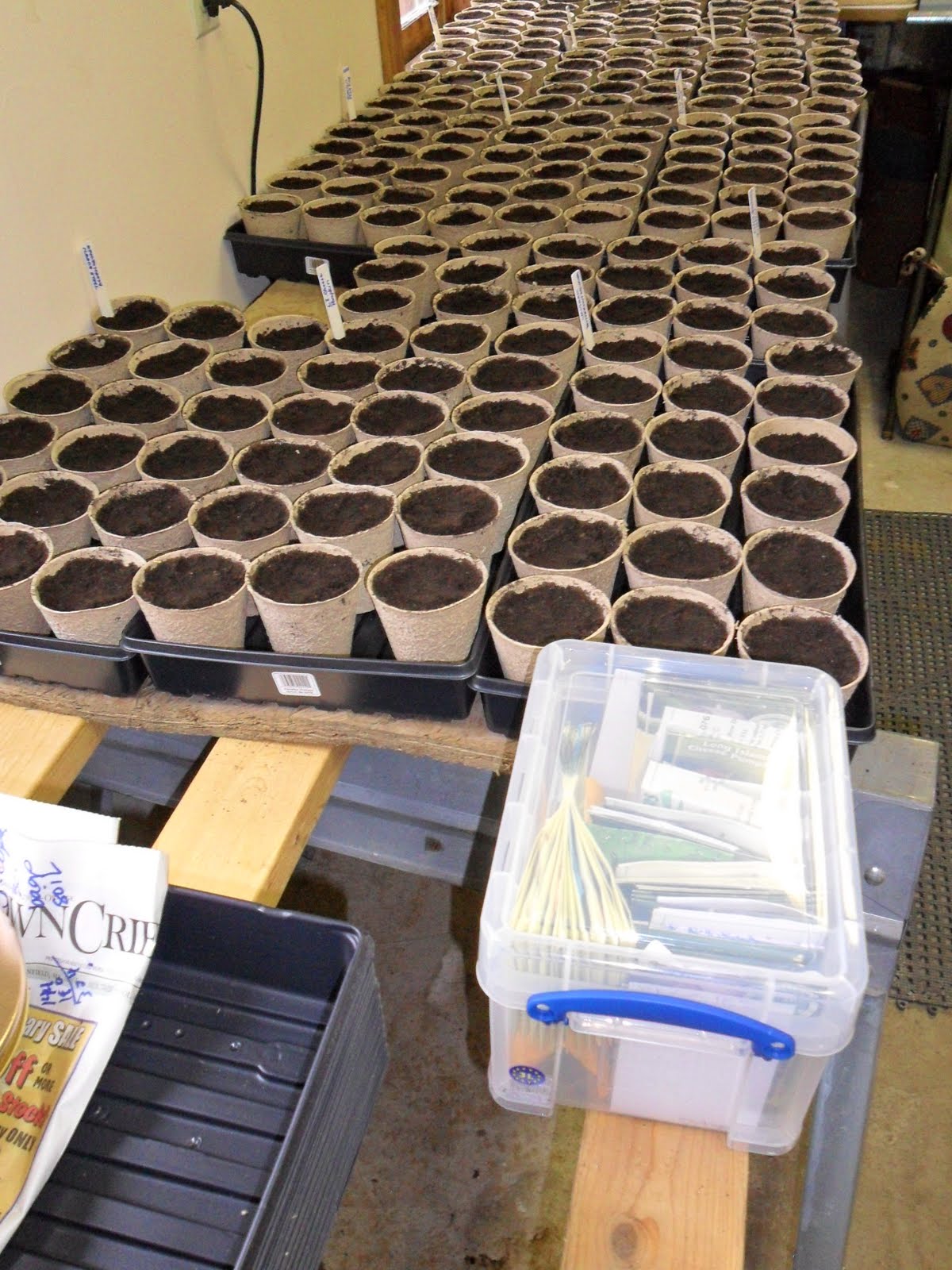 Last Sunday we planted seeds ~ finally. 314 seeds, to be exact. In eight pounds of potting soil which was, in turn, in 234 - 3" round pots and 4 - 10 square flats. Sounds like a lot, but there's still more to do. We had to stop because we ran out of table room for them all